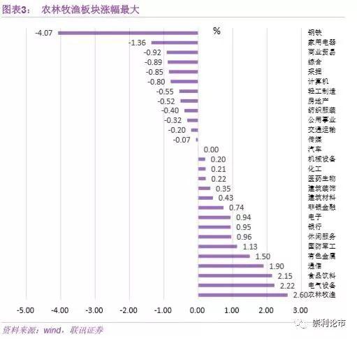 申万一级行业中,有15个行业实现上涨。农林牧渔板块周涨幅2.6%居于首位,涨幅居前的板块还有电气设备、食品饮料等;跌幅较大的板块有钢铁、家用电器、商业贸易、综合采掘,钢铁板块跌幅最大为4.07%。