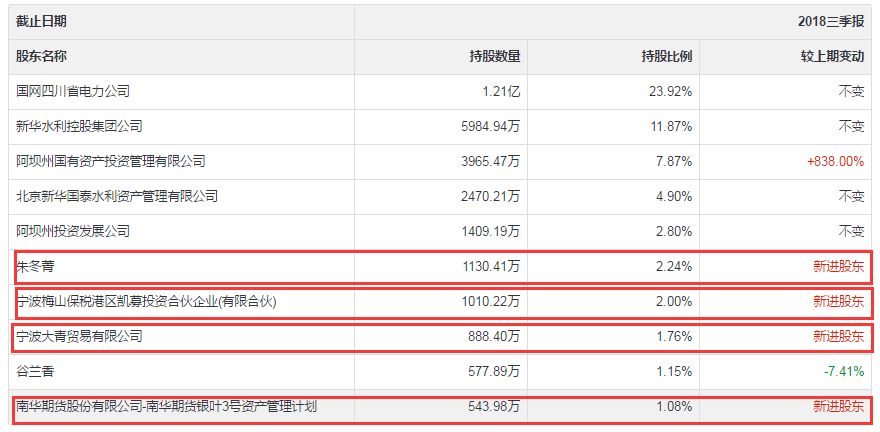 或许,岷江水电四个月逆势暴涨,与“宁波帮”第三季度大手笔买入有关。根据岷江水电3季报显示,公司十大股东中有四名是新进股东,分别为朱冬菁、宁波梅山保税港区凯募投资合伙企业(有限合伙)(以下简称宁波凯募)、宁波大青贸易有限公司、南华期货股份有限公司-南华期货银叶3号资产管理计划,四大股东持股比例合计约占上市公司总股本的7.08%。
