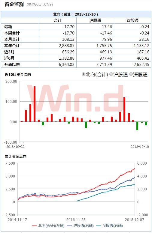 截止到12月10日,北上资金全年净流入A股2888.87亿元,其中沪股通净买入1755.756亿元,深股通净买入1133.12亿元。
