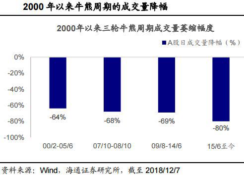 2000/2-2005/6期间,A 股每日成交量从2000/2最高的41亿股降至最低14.6亿股,降幅64%(这轮牛市最高点在01/6 高点,但成交量最高点在2000/2);