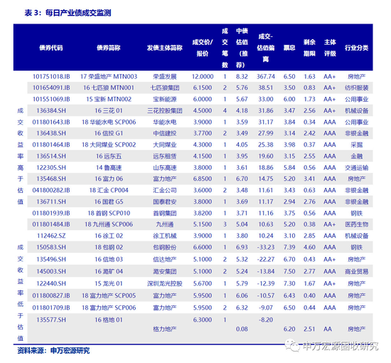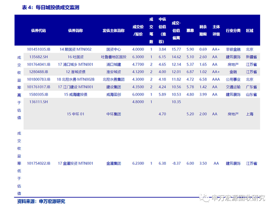 今日产业债交投较活跃,成交收益率高于估值的债券数量多于成交收益率低于估值的债券数量。成交收益率高于估值的债券分布在公用事业、非银金融等行业。成交收益率低于估值的债券主要分布在房地产行业,商业贸易等行业也有涉及。