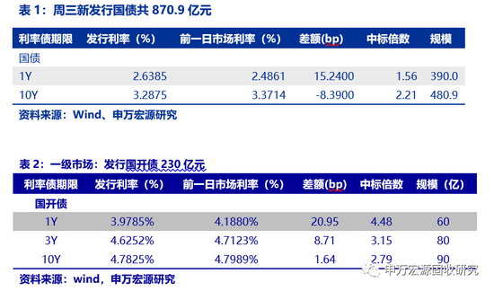 一级市场:周三新发行国债870.9亿元。周三1Y、10Y国债分别发行390亿元、480.9亿元,发行利率分别为2.6385%、3.2875%,中标倍数分别为1.56与2.21,需求一般。