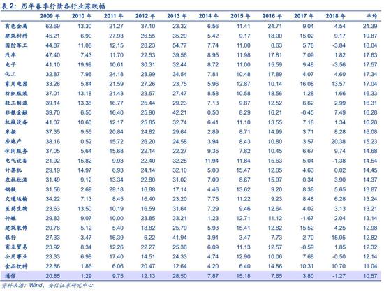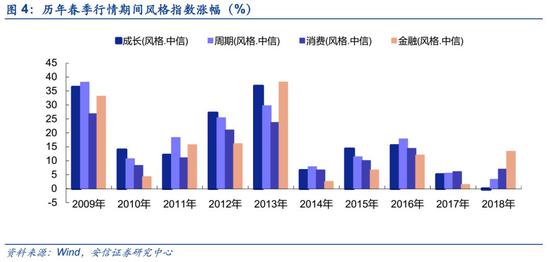 从历史上看,历年春季行情的主线都有所不同。2009年春季行情主要围绕四万亿计划展开;2011年则是来自周期品补库推动的周期行情;2012年在货币政策边际宽松和房地产政策放松预期的驱动下,周期品和房地产行业取得相对收益;2013年则是新型城镇化和美丽中国等政策推动各类相关主题;2014-2015年牛市期间,自贸区,一带一路,制造业升级,“互联网+”等相关主题均取得了较为明显的相对收益;2016-2017年,供给侧改革和新能源产业政策推进,周期品涨幅居前;2018年在金融去杠杆,行业集中度提升背景下,白马股成为春季行情主角。